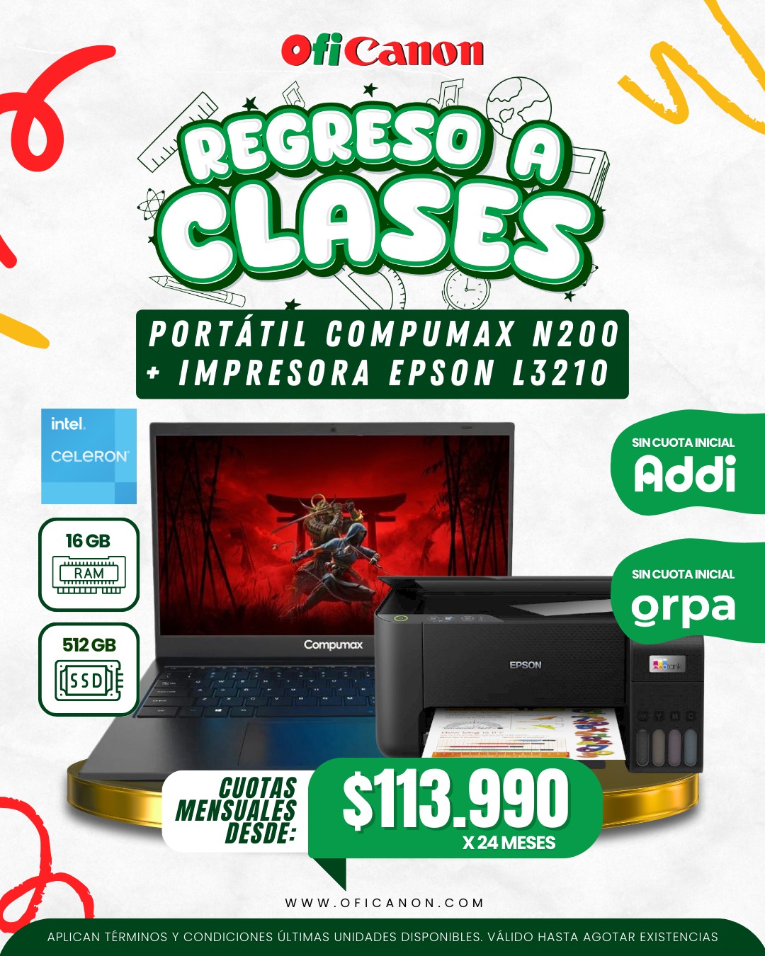 Un combo pensado para estudiantes que buscan eficiencia y excelente desempeño durante el regreso a clases. La portátil Compumax N200 ofrece fluidez para multitarea, videoclases y uso diario gracias a su amplia memoria RAM. Acompañada de la impresora Epson L3210, permite imprimir tareas y proyectos desde casa de forma práctica y económica. Una solución completa para estudiar, crear y cumplir con todas las actividades académicas.